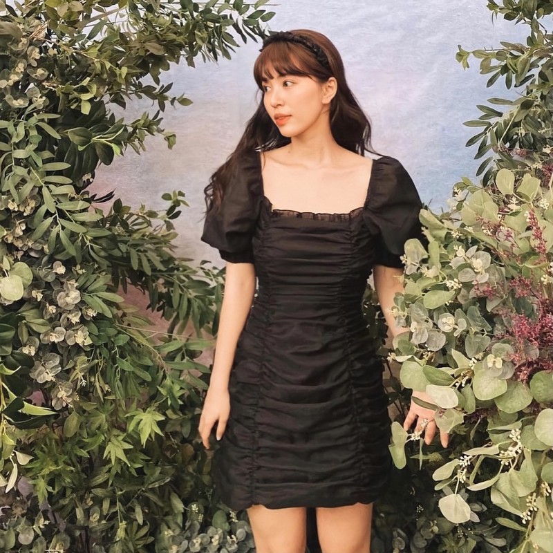 ARIANA DRESS /BL - Fitted Elastic Dress with Two Types of Square Neck, Low Cut Organza with Belt